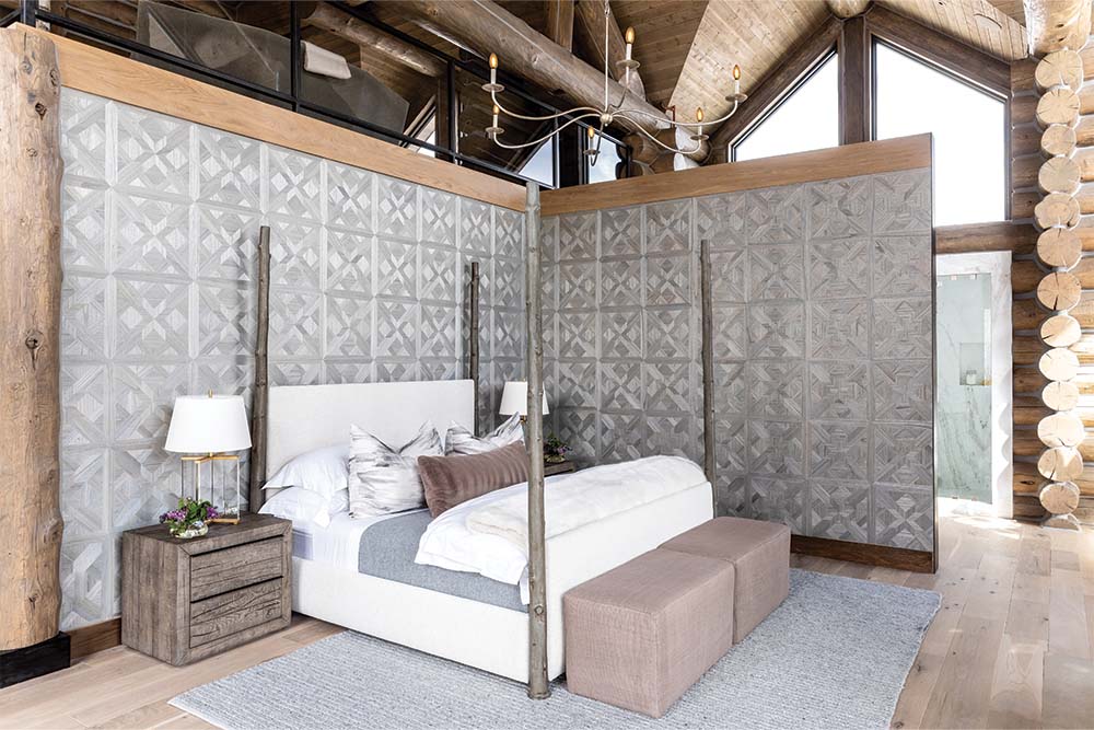 Our clients wanted the primary bedroom to feel serene. We accomplished that by blending the rustic elements of the home with a soft palette. What pulled the room together was the wood veneer wallpaper from Phillip Jeffries (that's right, wood!). The silver-blue undertones created a beautifully subtle contrast to the warmth coming from the log beams and hardwood. The wildwood poster bedframe, although rustic, is somewhat whimsical and feminine. Which we thought balanced out the energy of the space beautifully.