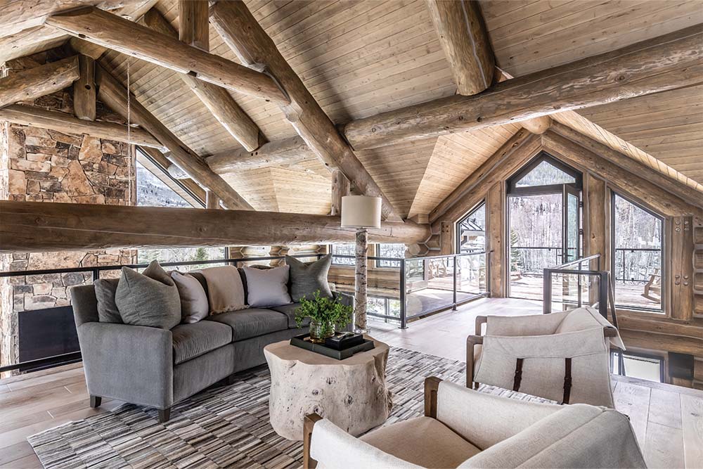 Looking down on the bedroom below, this office loft features some insanely beautiful mountain views and has two balconies. Truly, there will never be a more serene work environment than this. Walk into this office, and you'll immediately feel a sense of peace. The room is defined by a combination of rustic and modern design elements, with a few whimsical details in-between, like the Forester Birch floor lamp from Jamie Young Co.