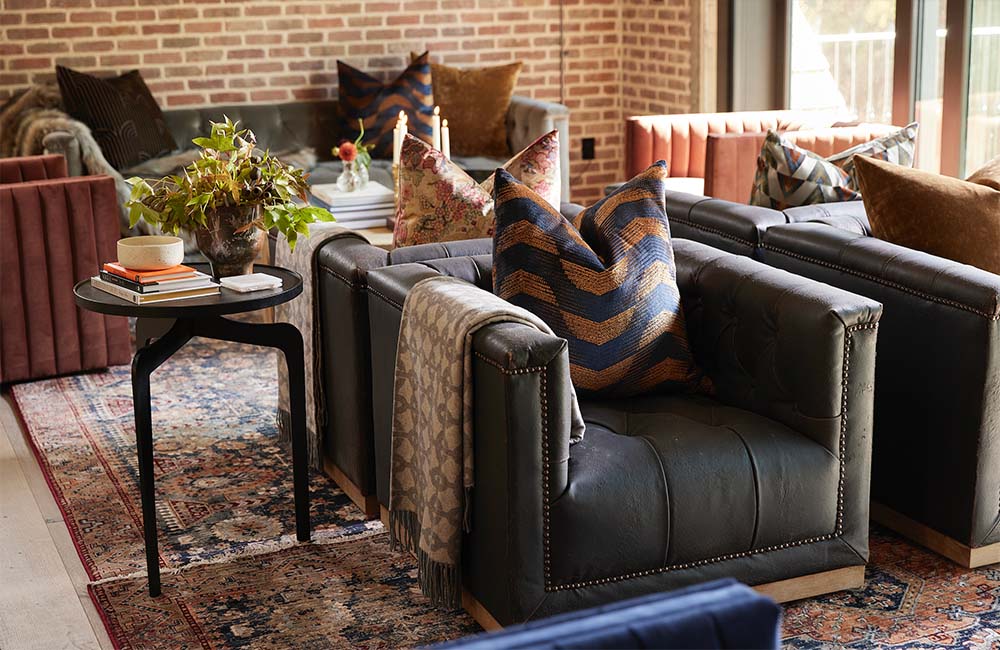 You are probably familiar with the saying "less is more," but we are here to tell you that sometimes more is, in fact, more! We had a total blast mixing and matching allll these different patterns. From the rugs to the throw pillows, to the drapery, to the brick... there is so much color and print to explore in this speakeasy-inspired living room. If you feel unsure about incorporating bold prints into your home, start by playing with your throw pillows. It's the easiest way to update and experiment with design.